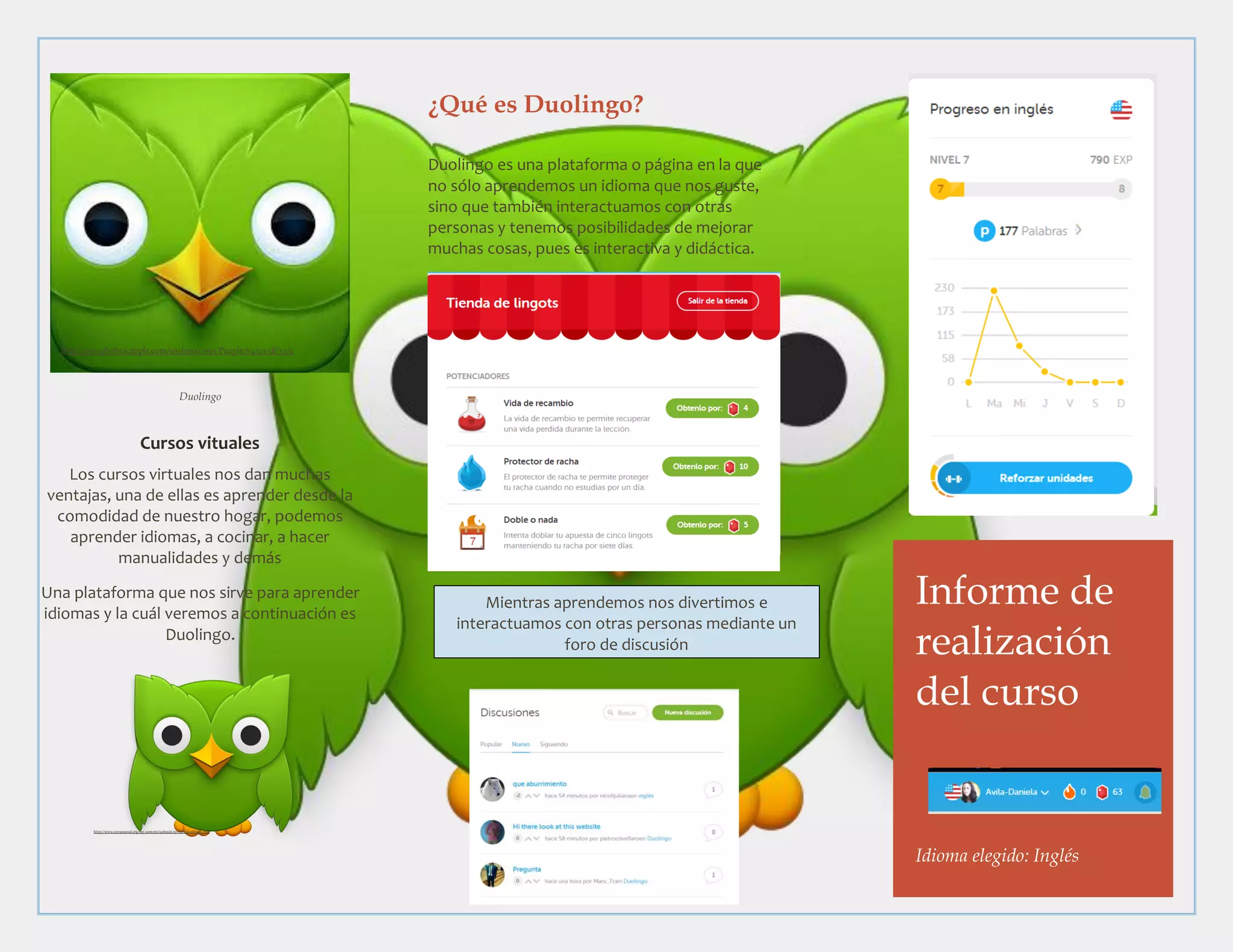 Duolingo es una plataforma para aprender idiomas de forma interactiva y divertida desde casa. Ofrece cursos virtuales de diferentes idiomas con lecciones, foros de discusión y funciones para ver el progreso del estudiante y compararlo con amigos. El estudiante puede aprender a su propio ritmo mientras se divierte interactuando con otros y recibiendo retroalimentación sobre su desempeño.