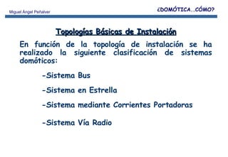 El documento describe las principales topologías de sistemas domóticos: bus, estrella, corrientes portadoras y radiofrecuencia. Explica que los sistemas de corrientes portadoras y radiofrecuencia usan la instalación eléctrica o transmisión inalámbrica para comunicar elementos como emisores y receptores, mientras que los sistemas bus y estrella usan cableado dedicado para conectar una unidad central con módulos periféricos. También resume algunos factores a considerar para cada topología como número de elementos, interferencias y compat