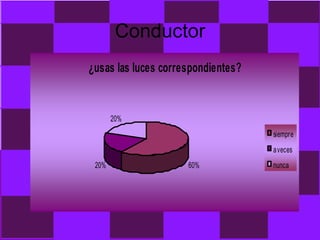 El documento presenta gráficos sobre el comportamiento de conductores, ciclistas y peatones en el tránsito. Muestra que la mayoría de conductores usan luces y cinturón de seguridad, pero pocos respetan semáforos y velocidades. Los ciclistas suelen dejar sus bicicletas en lugares permitidos pero no usar casco. Los peatones a veces cruzan en las sendas y respetan semáforos, esperando sobre veredas para cruzar.