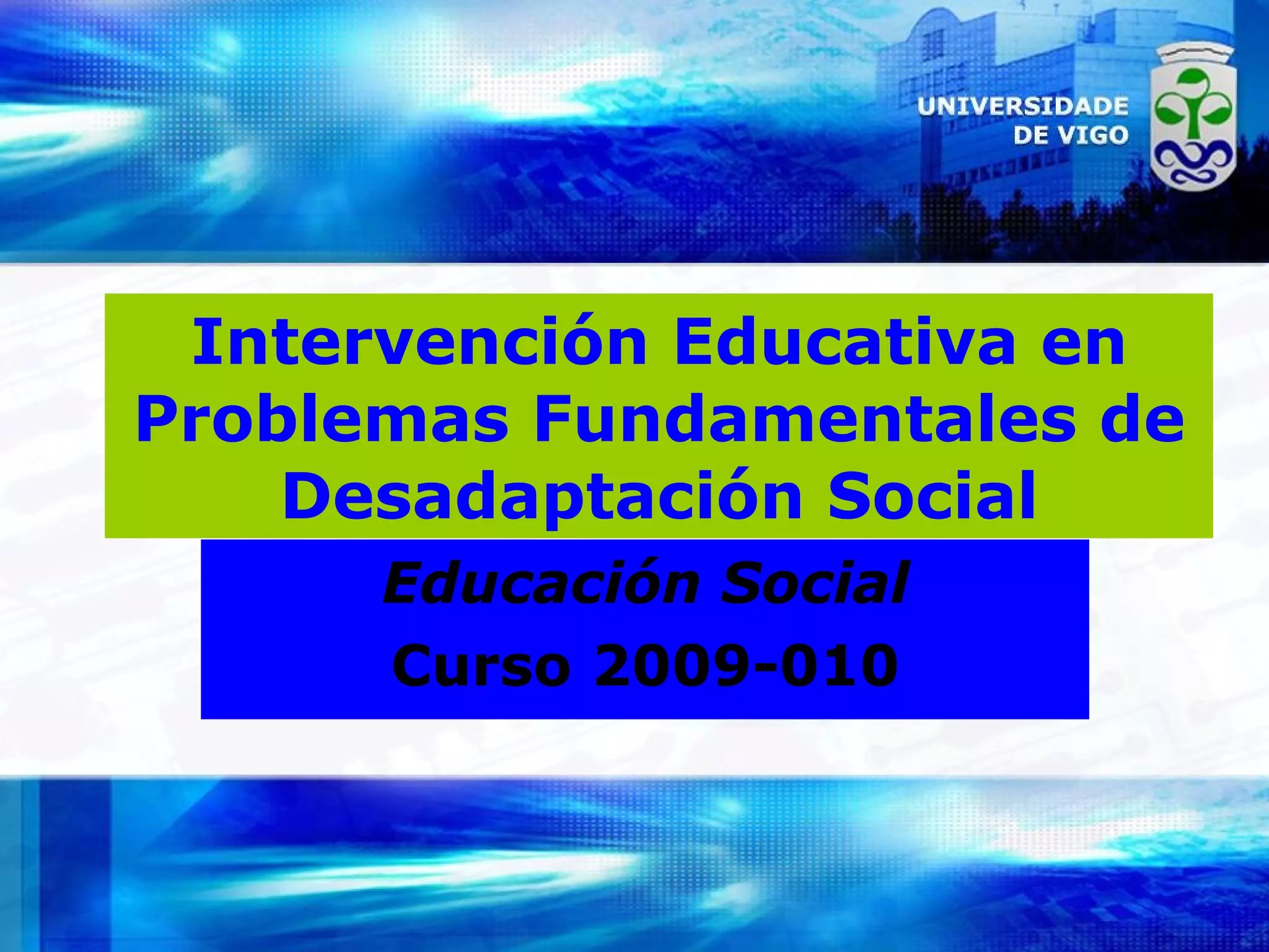Este documento presenta la asignatura "Intervención Educativa en Problemas Fundamentales de Desadaptación Social" impartida en la Universidad de Vigo. La asignatura se compone de una parte teórica y otra práctica, cubriendo temas relacionados con la protección de menores. La evaluación se basa en exámenes, actividades en clase y prácticas. Se proporciona información sobre el profesorado, horarios de tutoría, bibliografía recomendada y normas de asistencia.