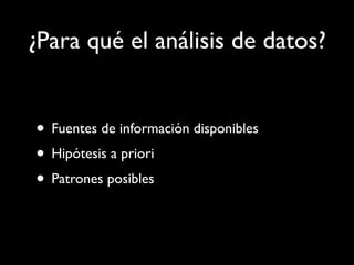 El documento explora el proceso de análisis de datos, su importancia y diversas técnicas, destacando la evolución desde hojas de cálculo hasta el uso de herramientas avanzadas como R. Se abordan las fases del análisis, la visualización de datos y la identificación de patrones y outliers. Además, se presentan ejemplos de aplicaciones en arte y redes tróficas, así como software y herramientas disponibles para el análisis y visualización de datos.
