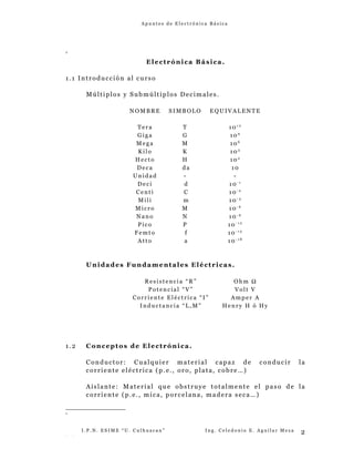 1) El objetivo del curso es proveer conocimientos teóricos y prácticos de Electrónica Básica para que las personas puedan realizar mantenimiento sencillo de equipo electrónico. 2) El curso cubre temas como elementos electrónicos básicos, conceptos de circuitos eléctricos, mediciones eléctricas y electrónicas, diodos semiconductores, transistores bipolares y detalles prácticos de manten