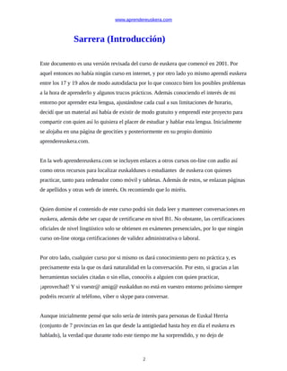 Este documento presenta un curso gratuito de euskera en línea. El autor creó el curso en 2001 cuando no había otros cursos disponibles en internet, y se basó en su propia experiencia aprendiendo euskera de forma autodidacta entre los 17 y 19 años. El curso contiene lecciones que cubren gramática, vocabulario y conversación para que los estudiantes puedan leer y mantener conversaciones básicas en euskera al nivel B1. Aunque el curso en línea no otorga certificaciones oficiales, el autor espera que sea