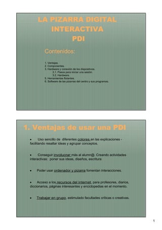 La pizarra digital interactiva (PDI) ofrece varias ventajas educativas como permitir diferentes colores en las explicaciones, involucrar más a los estudiantes a través de actividades interactivas, y acceder a recursos en internet. Una PDI típica consta de una pizarra, proyector, lápiz u otras herramientas, y un ordenador. Se conecta el hardware como el ordenador al proyector y la pizarra digital. Los programas de software de la pizarra digital permiten usarla como un ordenador interactivo.