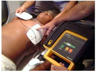 El documento proporciona información sobre soporte vital básico. Explica que aproximadamente el 8-12.5% de las muertes podrían haberse evitado y que la muerte súbita es la principal causa de muerte cardiovascular. Describe los pasos básicos de RCP, incluidas 30 compresiones torácicas seguidas de 2 ventilaciones, y enfatiza la importancia de iniciar RCP de inmediato y activar los servicios de emergencia. También cubre el uso de desfibriladores externos automáticos.
