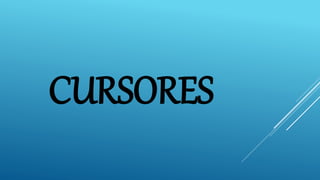 Este documento explica los cursores en bases de datos, que son objetos que permiten manipular datos fila a fila en lugar de en bloques. Detalla la sintaxis para declarar, abrir, leer y cerrar cursores, así como ejemplos de su uso para la creación, modificación y eliminación de datos.