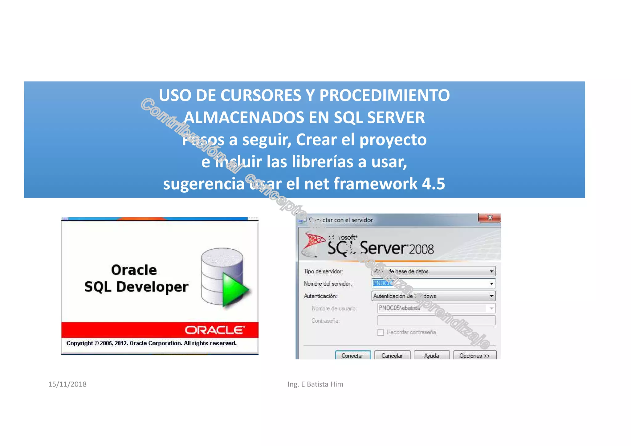 El documento describe los pasos para usar cursores y procedimientos almacenados en SQL Server y Oracle 11g, incluyendo crear un proyecto, incluir librerías, sugerencia de usar .NET Framework 4.5, ejecutar consultas, y mostrar datos en un formulario de Visual Studio desde una base de datos.