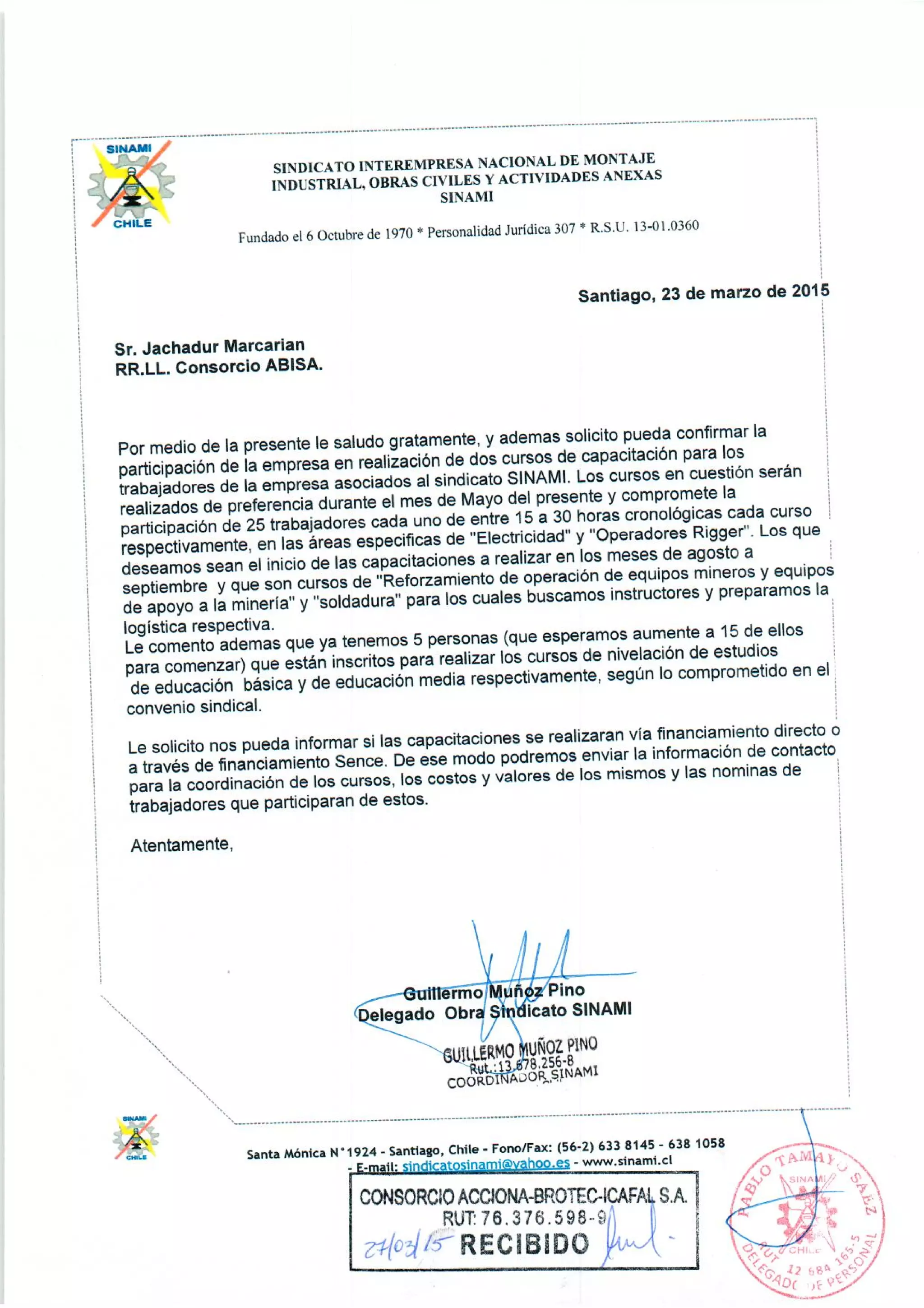 Solicitud de realización y financiamiento según convenio sindical de los de cursos de capacitación.