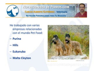 Este documento presenta cursos de nutrición canina ofrecidos por un experto que ha trabajado con diversas empresas del sector de alimentos para mascotas. Aboga por la importancia de una alimentación variada y de calidad para los perros, y ofrece consulta y asesoría a dueños de mascotas a nivel mundial. Invita a compartir sus contenidos en redes sociales y a inscribirse en sus boletines y cursos gratuitos.