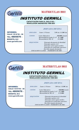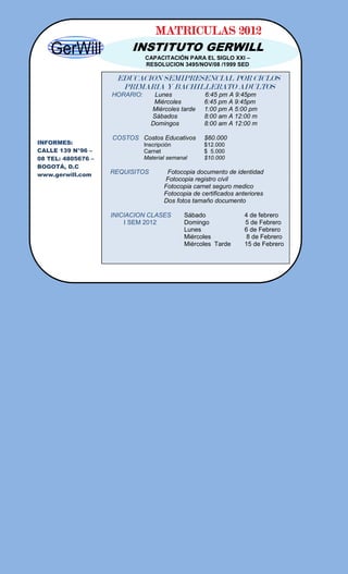 El documento presenta la información sobre las matrículas para el año 2012 en el Instituto Gerwill, el cual ofrece programas de educación presencial, semipresencial y a distancia para primaria, bachillerato, educación para el trabajo y diplomados. Se detallan los horarios, costos, requisitos e inicios de clases para cada programa.