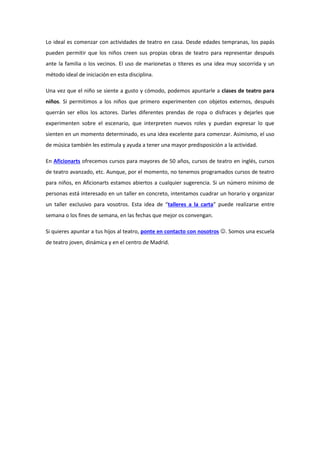 El documento describe cómo el teatro puede ser beneficioso para los niños al fomentar su creatividad y habilidades sociales, y recomienda introducirlos al teatro a través de actividades en casa como títeres y disfraces antes de apuntarlos a clases. También ofrece cursos de teatro para diferentes edades, aunque no actualmente para niños, pero están abiertos a sugerencias para organizar talleres especiales.