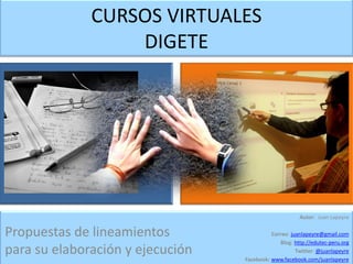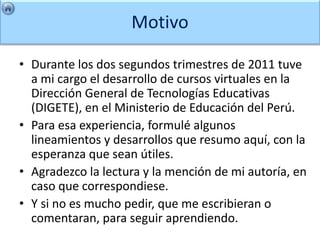 Este documento presenta lineamientos para el desarrollo y ejecución de cursos virtuales en el Ministerio de Educación del Perú. Propone definir perfiles de entrada para los participantes, realizar una encuesta diagnóstica, y limitar la matrícula a 400 participantes manejados por tutores. También recomienda diseñar un espacio virtual de aprendizaje accesible, pertinente y operativo siguiendo criterios como la navegabilidad, actividades educativas y una estructura jerárquica clara.