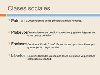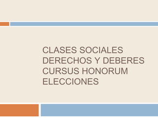 El documento detalla las clases sociales en Roma, incluyendo patricios, plebeyos, esclavos y libertos, así como sus derechos y deberes. Se describe el proceso electoral, los requisitos para ser candidato, las diferentes magistraturas y el funcionamiento de las elecciones. Además, se menciona la evolución de los derechos plebeyos a lo largo del tiempo y la organización de votaciones en varios comitia.