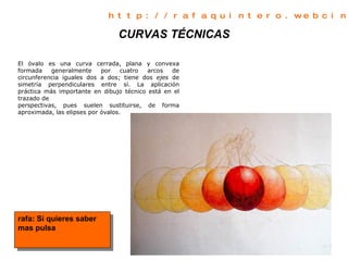 El documento describe diferentes tipos de curvas técnicas como óvalos, ovoides, espirales, volutas y hélices, e incluye instrucciones detalladas para construir cada una conociendo ciertos parámetros como ejes, diámetros o pasos. Explica que conocer cómo trazar estas curvas es fundamental para la realización de piezas técnicas y ofrece enlaces adicionales para más información.