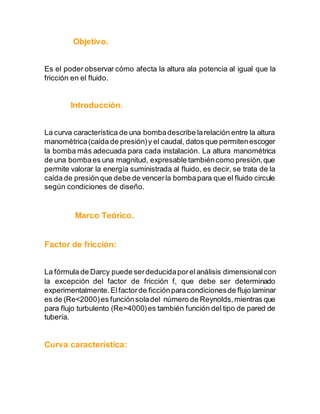 Este documento describe un experimento para medir el flujo volumétrico de una bomba a diferentes alturas. Se midió el tiempo que tomó llenar un volumen fijo de agua para varias alturas de la manguera conectada a la bomba. Luego, se calculó el flujo volumétrico en cada caso usando la ecuación de continuidad. Finalmente, se graficó la altura contra el flujo volumétrico para obtener la curva característica de la bomba.