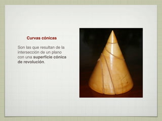 El documento explica las curvas cónicas, que son las que resultan de la intersección de un plano con una superficie cónica de revolución. Las tres curvas cónicas principales son la elipse, la parábola y la hipérbola. Se describen los elementos característicos de cada una como ejes, focos, directrices, así como métodos para su construcción.