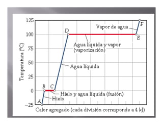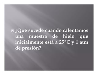 El documento describe el proceso de calentamiento de una muestra de hielo inicialmente a 25°C y 1 atm de presión. Explica que la temperatura aumentará hasta 0°C cuando el hielo comenzará a derretirse, y que la adición de calor se usará para la fusión hasta que todo el hielo se convierta en agua a 0°C. Luego, la temperatura del agua aumentará hasta los 100°C cuando comience la ebullición, y el calor se usará para la vaporización hasta convertir todo el agua en vapor a 100°C.