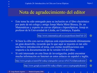 Este documento presenta una introducción a la cifra con curvas elípticas. Explica conceptos clave como curvas elípticas, suma de puntos en una curva elíptica, criptosistemas como ElGamal elíptico y firma digital con curvas elípticas. Finalmente, discute desafíos actuales y futuros de la investigación en este campo.