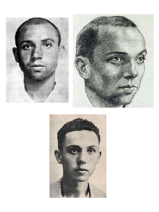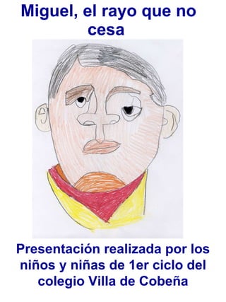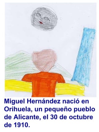 Este documento presenta un resumen biográfico de Miguel Hernández, poeta español. Nació en 1910 en Orihuela, Alicante y ayudó a su padre con el ganado desde pequeño. Publicó su primer libro a los 20 años y ganó un premio literario a los 21. Se enroló en el ejército republicano durante la Guerra Civil y escribió poemas en prisión tras ser condenado a muerte. Murió en 1942 a los 31 años de edad debido a una enfermedad pulmonar contraída en prisión.