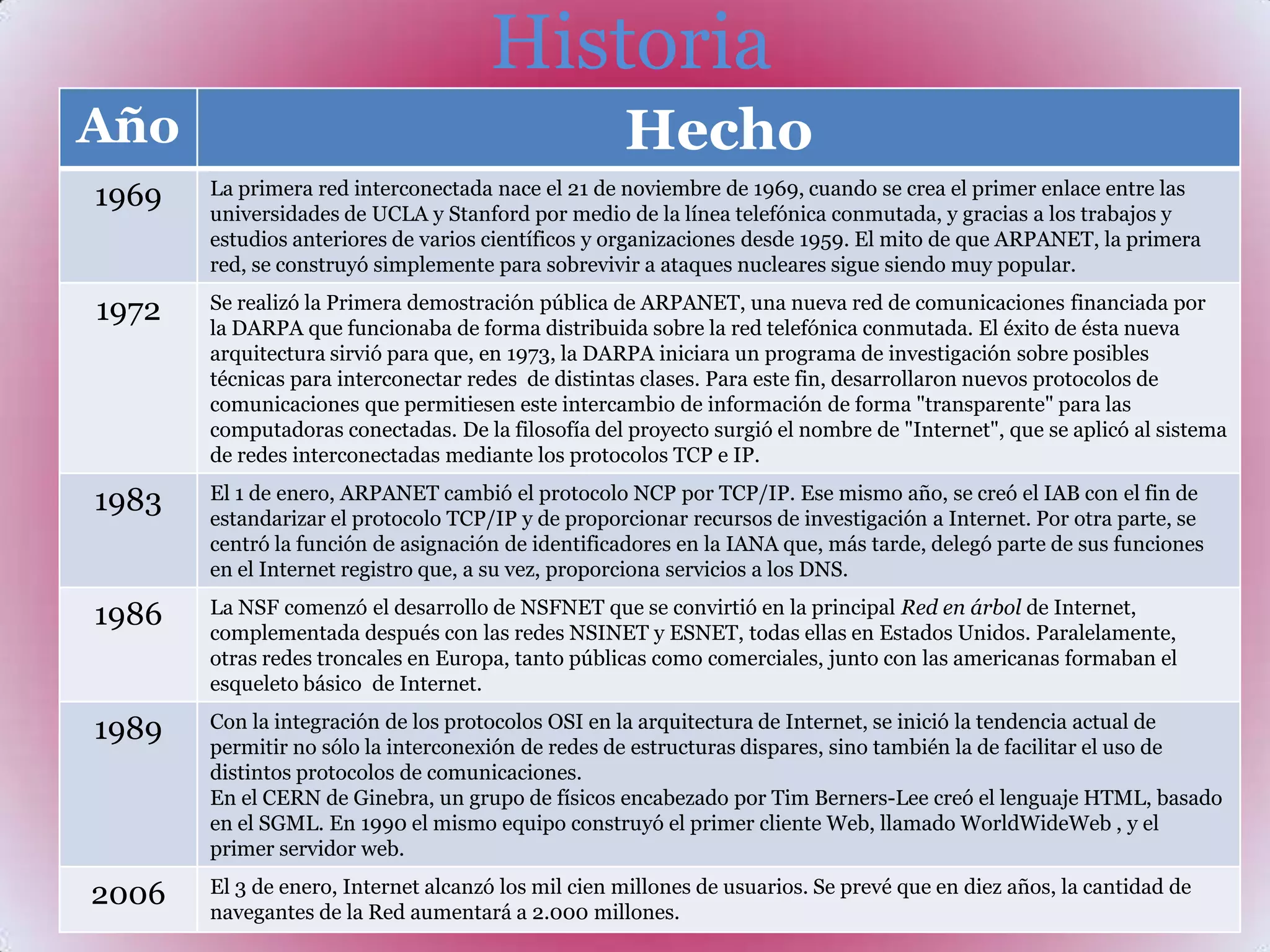 Internet es un conjunto descentralizado de redes interconectadas que utilizan protocolos TCP/IP para funcionar como una red lógica única a nivel mundial. Sus orígenes se remontan a 1969 con la creación de ARPANET que conectó universidades en California y Utah. La World Wide Web es un servicio popular en Internet que permite la consulta remota de archivos de hipertexto, aunque existen otros servicios como correo electrónico, transferencia de archivos y conversaciones en línea.