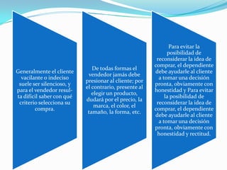 Este documento describe diferentes tipos de clientes y estrategias para interactuar con ellos. Identifica clientes indiferentes, recelosos, discutidores, poco amables, impulsivos, vacilantes y arrogantes. Recomienda reconocer el carácter del cliente para saber cómo actuar ante cada uno de manera que facilite las ventas y el éxito de la compañía representada.