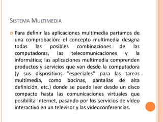El documento describe la historia y evolución de los sistemas multimedia, desde las primeras propuestas en 1945 hasta su desarrollo en las décadas siguientes. Explica los elementos clave de las aplicaciones multimedia como texto, audio, video e interactividad, y destaca sus ventajas como consistencia en la información y aumento de la retención. También define términos multimedia como hipermedia, digital y reproductor multimedia.