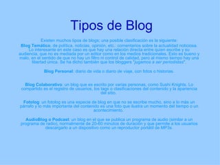 Los blogs permiten el diálogo entre lectores y autores a través de comentarios, aunque depende de la configuración elegida por el autor. Existen diversos tipos como blogs temáticos, personales, colaborativos, fotoblogs y podcasts. Las características comunes incluyen comentarios, enlaces, enlaces inversos, fotografías, vídeos y formatos para su distribución como RSS.