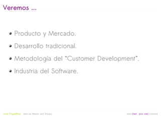 El documento describe la metodología de "Customer Development", la cual enfatiza el desarrollo del producto y el cliente de manera paralela desde el primer día. Esto involucra salir de la oficina para descubrir al cliente real a través de pruebas y métricas medibles, e iterar rápidamente basado en lo aprendido para validar hipótesis sobre el encaje producto-mercado. La industria del software tiene ventajas inherentes para este enfoque debido a su capacidad de probar features de forma aislada y recopilar métricas de