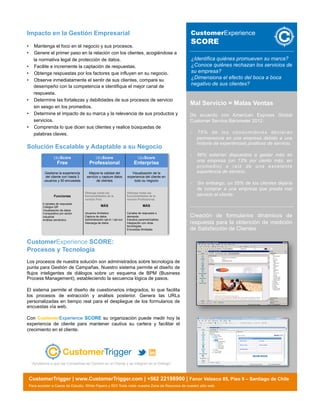 El 'Customer Experience Score' de CustomerTrigger ofrece una solución integral para medir y gestionar la experiencia del cliente, integrando tecnología y procesos para optimizar la fidelización y recomendación de marcas. Proporciona un panel de control que permite comparar el desempeño de las empresas con la competencia y abarca múltiples canales de respuesta para obtener retroalimentación. Además, ayuda a identificar fortalezas y debilidades en los procesos de servicio, facilitando el crecimiento y el compromiso del cliente.