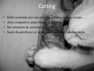 Este documento describe el cutting o autolesionismo, incluyendo sus causas como violencia familiar o acoso, indicadores como usar ropa invernal todo el tiempo, y consecuencias como cicatrices o infecciones. También recomienda formas de ayudar a quienes lo practican como escucharlos y ayudarlos a encontrar recursos, y menciona que el cutting suele presentarse en la pre-adolescencia y adolescencia.