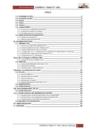 3) Establece objetivos generales como llegar a ser la empresa líder en el mercado local, regional, nacional e internacional ofreciendo un producto diferenciado que satisfaga las necesidades de los consum