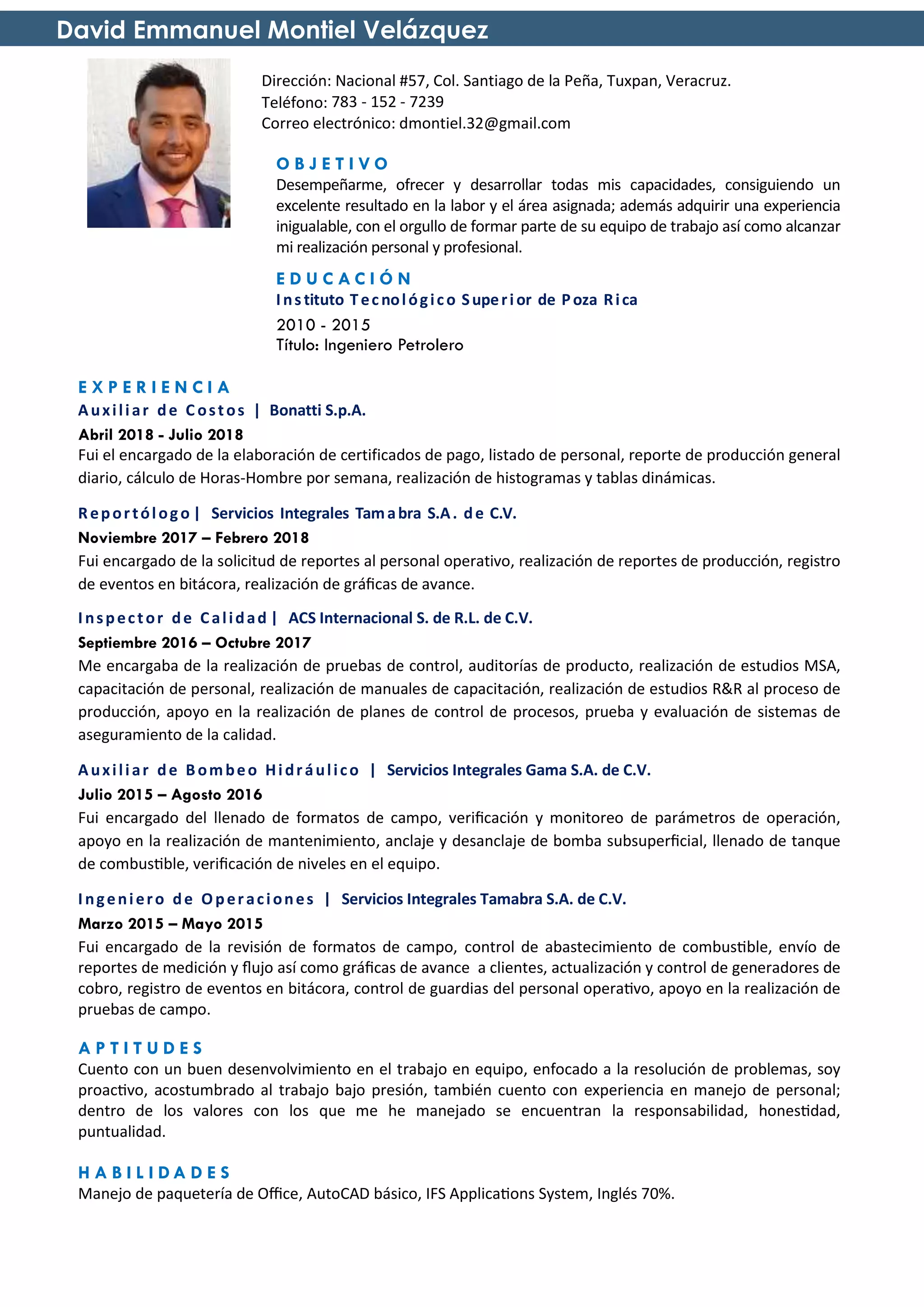 David Emmanuel Montiel Velázquez es un ingeniero petrolero con experiencia en áreas como costos, reporte de producción e inspección de calidad. Ha trabajado en distintas empresas del sector, ocupando roles que requieren habilidades en análisis de datos y manejo de personal, además de tener competencias en el manejo de software técnico y un nivel básico de inglés. Su objetivo profesional es contribuir al equipo de trabajo mientras adquiere experiencia y logra su realización personal y profesional.
