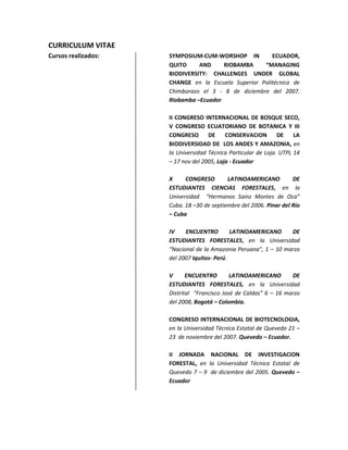 El documento presenta el currículum vitae de Cristian Paul Sarango Ureña, un ingeniero forestal ecuatoriano de 32 años. Detalla su educación universitaria, experiencia laboral en temas ambientales y forestales, así como los numerosos cursos y congresos que ha tomado en estas áreas.