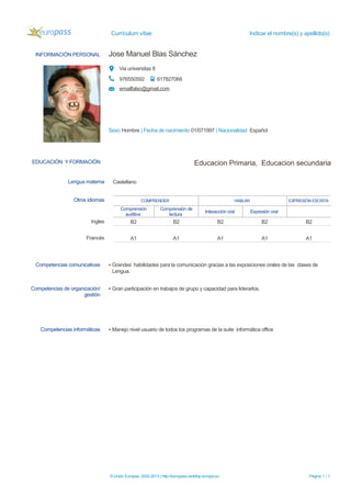 Este currículum vitae resume la información personal, educación y formación de Jose Manuel Blas Sánchez. Detalla su nombre, dirección, teléfono, correo electrónico, sexo, fecha de nacimiento y nacionalidad. Además, incluye detalles sobre su educación primaria y secundaria, y niveles de competencia en inglés y francés. Resalta sus habilidades comunicativas gracias a exposiciones orales, capacidad para trabajar en grupo y liderarlos, y conocimientos básicos de programas de office.