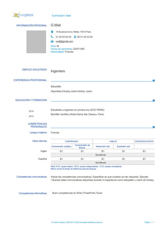 Este currículum resume la información personal y profesional de un candidato a ingeniero. Actualmente estudia su primer año de ingeniería en ECE Paris después de haber obtenido un bachillerato científico. Tiene experiencia como babysitter y entrenador de hockey. Domina el francés e inglés a nivel B1 y el español a nivel B1, adquiridos durante su educación secundaria.