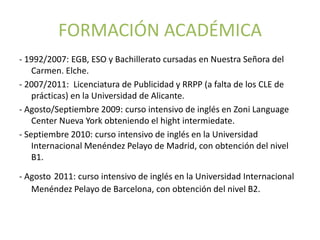 Este documento resume la formación académica y experiencia de Nuria Ruiz de Lope Alemañ. Ella obtuvo una licenciatura en Publicidad y Relaciones Públicas de la Universidad de Alicante en 2011, y ha tomado varios cursos intensivos de inglés en los Estados Unidos y España para mejorar su nivel de inglés hasta B2. También tiene experiencia con programas de diseño como Quark Express, Photoshop e InDesign.