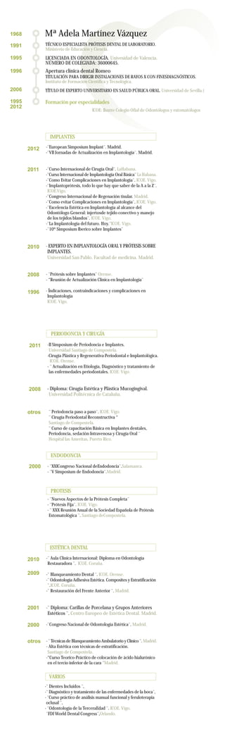 Este documento presenta el resumen curricular de Ma Adela Martínez Vázquez. Detalla su educación formal que incluye un título de técnico especialista en prótesis dental en 1991, una licenciatura en odontología de la Universidad de Valencia en 1995, y un título de experto universitario en salud pública oral de la Universidad de Sevilla en 2006. Además, enumera numerosos cursos y formaciones especializadas que ha completado en áreas como implantes, periodoncia, cirugía, endodoncia, prótesis y estética