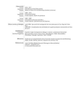 Este documento presenta el perfil profesional de Alejandra Terán, una profesional versátil con experiencia en marketing, investigación de mercados, y gestión de clientes en diferentes industrias como bienes de consumo masivo, cosméticos, y seguridad. Actualmente trabaja como Asistente de Brand Manager para Henkel Ibérica donde apoya al departamento de marketing con tareas como el seguimiento de pedidos, diseño de materiales promocionales, y administración de redes sociales. Tiene una maestría en marketing y comercio, y domina varios