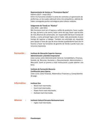 Este documento presenta el currículum vitae de Luis Alfredo Celi Torres. Celi Torres actualmente estudia Administración y Gestión Empresarial y previamente estudió Administración Bancaria. Cuenta con experiencia en cargos como Jefe de Módulo, Representante de Ventas y Subgerente de Tienda. Sus habilidades incluyen atención al cliente, manejo de personal, ventas, trabajo en equipo y administración.