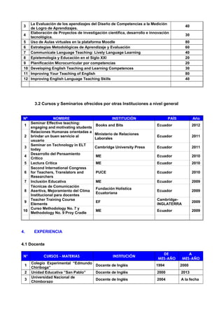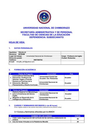 La hoja de vida presenta los datos personales y formación académica de Myriam Trujillo, profesora de inglés de la Universidad Nacional de Chimborazo. Detalla su licenciatura en ciencias de la educación con especialidad en inglés y francés, doctorado en planeamiento y diseño curricular, y diplomado en metodología para la enseñanza del inglés. Además, describe su experiencia docente universitaria y en colegios, así como cursos y seminarios recibidos en temas de enseñanza de idiomas.