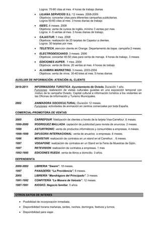 Este documento presenta el currículum de Rosa María Prieto Panero. Tiene experiencia en ventas y atención al cliente en diversos sectores como telemarketing, turismo, libros y seguros. Sus habilidades incluyen empatía, trabajo en equipo y atención al cliente. Está buscando un puesto que aproveche sus capacidades de ventas y servicio al cliente.