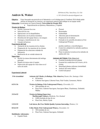 Andrew K. Walzer busca un puesto en un laboratorio o bodega para la vendimia 2016 donde pueda utilizar su formación en ciencias y experiencia previa. Se graduó en 2014 de la Universidad de Oregón con una licenciatura en ciencias generales con especialización en química, matemáticas y español. Tiene experiencia trabajando en bodegas y viñedos en California, Nueva Zelanda y Chile, realizando tareas como recepción de uvas, selección, operaciones en prensa neumática, embotellado, an