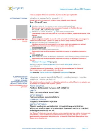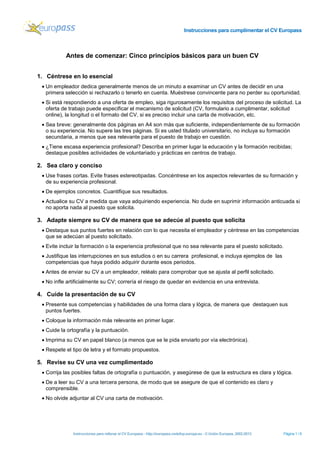 Este documento proporciona instrucciones para completar un CV Europass de forma efectiva. Explica que un CV debe centrarse en lo esencial, ser claro y conciso, y adaptarse al puesto deseado. También ofrece consejos sobre la presentación y revisión del CV antes de enviarlo.