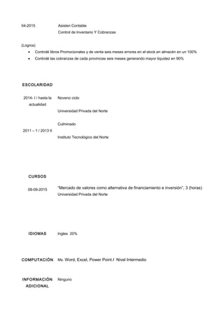 Este documento presenta el currículum vitae de John Henry Ruiz Contreras, un técnico en contabilidad y finanzas con 9 años de experiencia. Actualmente estudia el noveno ciclo de la carrera de Contabilidad y Finanzas en la Universidad Privada del Norte. Ha trabajado como asistente contable en dos empresas donde desarrolló habilidades como el trabajo en equipo. Su objetivo es trabajar en una empresa reconocida a nivel nacional especializándose en finanzas.