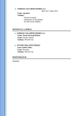 Este currículum vitae resume la información personal y profesional de Klinton Alizon Antay Pucllas. Actualmente estudia la carrera de Mecánica Automotriz y cuenta con experiencia en el mantenimiento de ómnibus en centros mecánicos. Busca empleo donde pueda aplicar sus conocimientos técnicos y habilidades de trabajo en equipo para resolver problemas de manera eficiente.