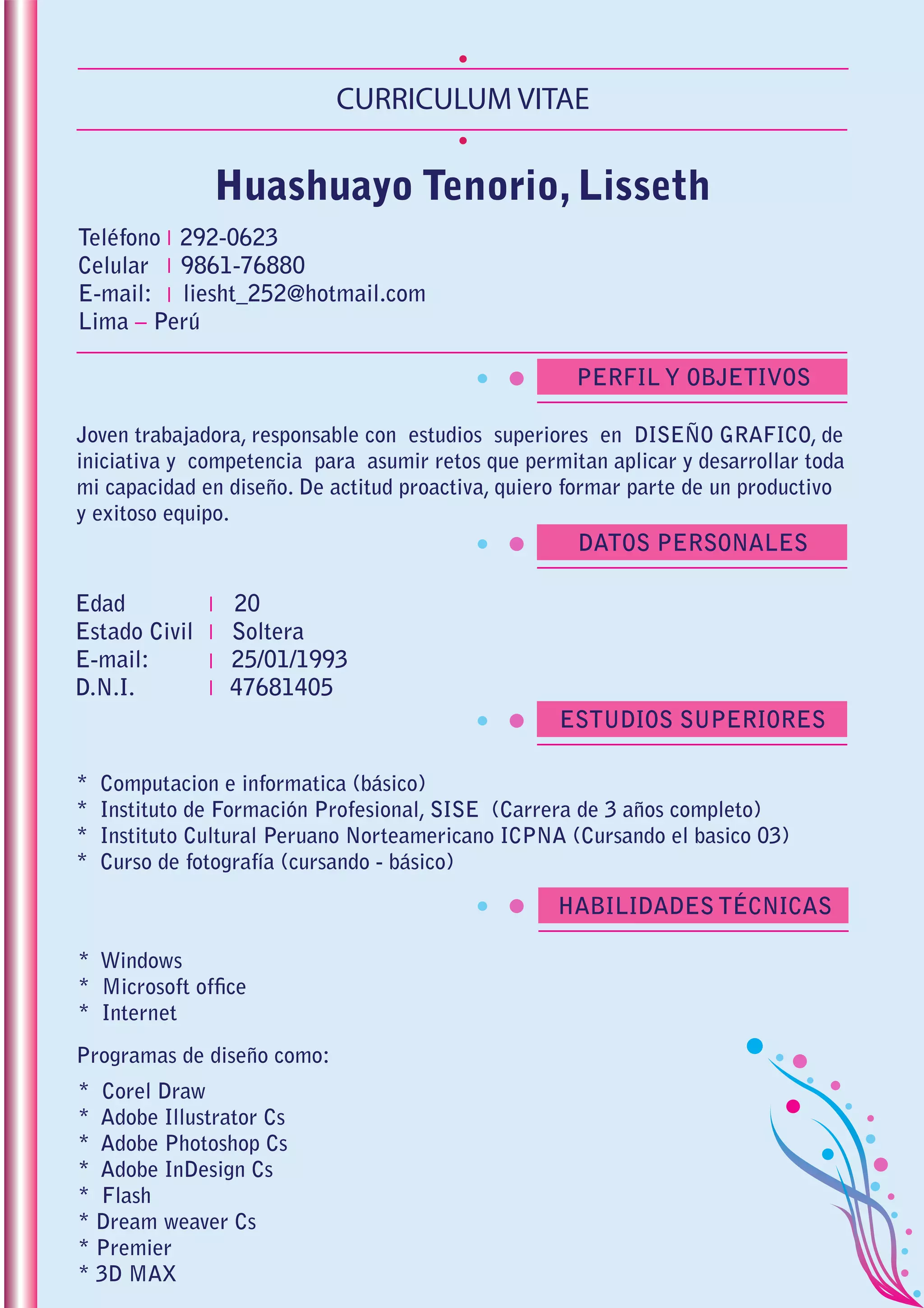 Este currículum vitae presenta los datos personales, educación y experiencia laboral de Lisseth Huashuayo Tenorio. Actualmente estudia Diseño Gráfico y tiene experiencia como asistente de diseño en una imprenta digital y diseñadora para una artesanía. Domina programas de diseño como Corel Draw, Photoshop y Illustrator. Su objetivo es formar parte de un equipo exitoso donde pueda aplicar sus habilidades en diseño.