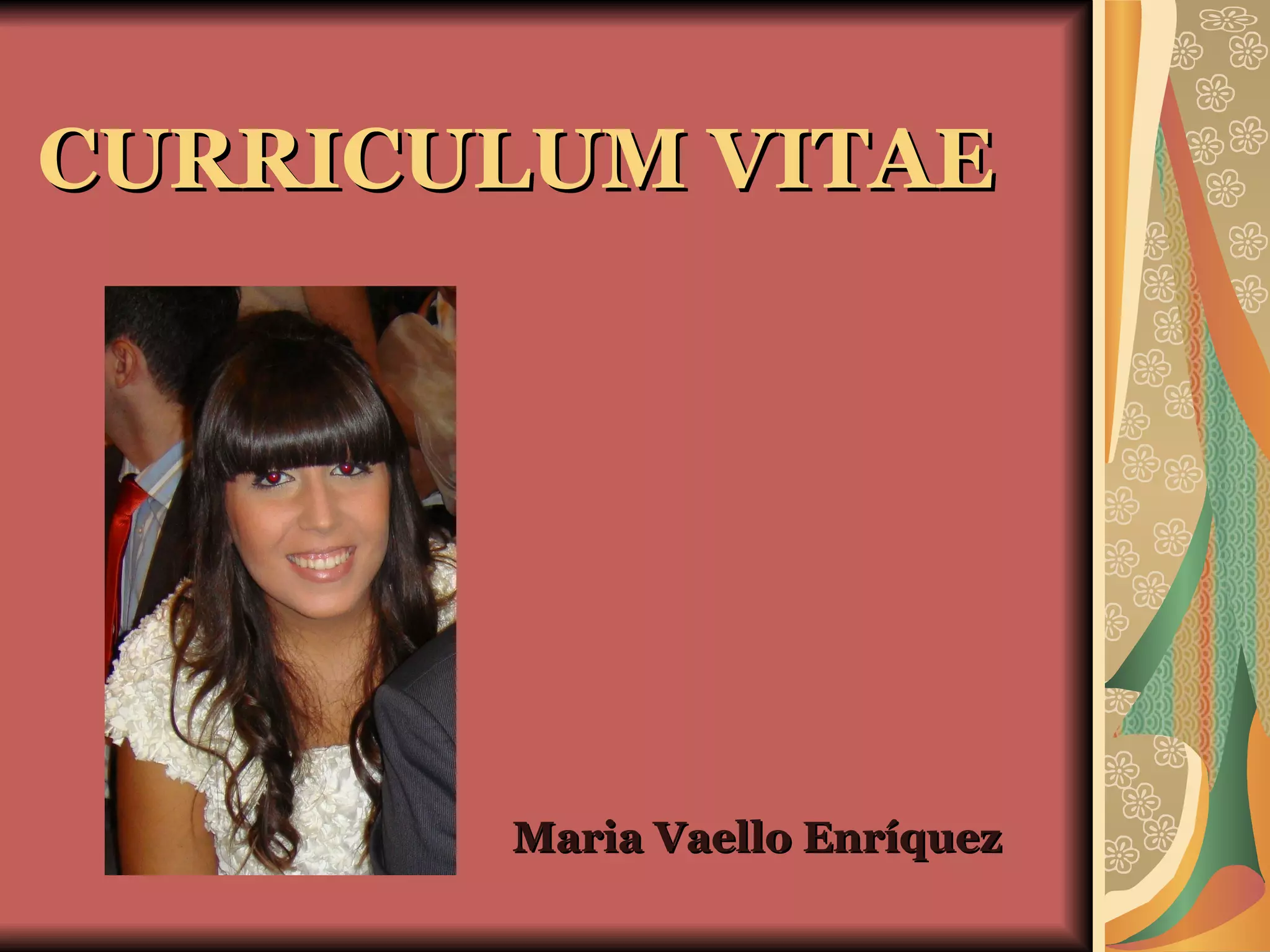 Este currículum vitae resume la información personal, formación académica, idiomas, programas informáticos, y experiencia profesional de Maria Vaello Enríquez. Actualmente cursa la licenciatura de Publicidad y RR.PP. en la Universidad de Alicante. Habla con fluidez castellano, valenciano e inglés. Ha realizado prácticas en el ayuntamiento de Benidorm y trabajado como promotora para varias marcas a través de agencias de publicidad.