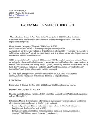 Este documento es el currículum vitae de Laura Maria Alonso Herrero. Resume su experiencia laboral en museos y centros culturales como el Museo Nacional Centro de Arte Reina Sofía y el Museo Nacional del Prado. También tuvo trabajos de teleoperadora y gestora de viajes. Completa su formación con una licenciatura en Historia del Arte, cursos de idiomas como inglés y francés, y formación en educación sociocultural, diseño gráfico e informática.