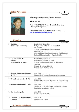 Este currículum vitae presenta los antecedentes de Pablo Alejandro Fernández, un profesional de 25 años con estudios en análisis de sistemas e informática y experiencia en atención al cliente, reparación y mantenimiento de computadoras. Detalla su formación académica, incluyendo títulos secundarios y universitarios, así como cursos y seminarios relacionados a la informática. Además, enumera sus trabajos previos en tiendas de computación y como técnico independiente de reparación de PC.