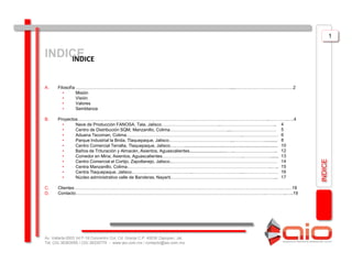 Arquitectura Industrial de Occidente (AIO) es una empresa de construcción industrial con más de 1 millón de metros cuadrados construidos. El documento presenta la filosofía, proyectos, clientes y contacto de AIO, destacando proyectos como parques industriales, centros de distribución, centros comerciales y naves industriales para clientes como Walmart, CICSA y SQM.